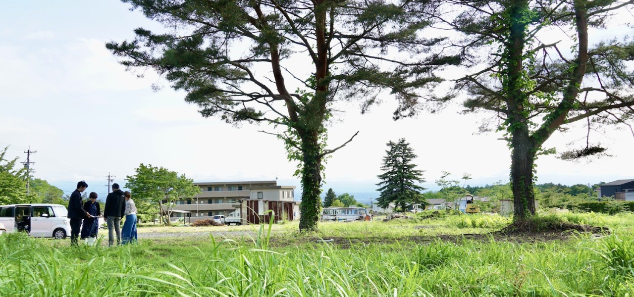 御代田ヴィレッジの敷地も見学。ヴィレッジのほぼ中央に残した2本の既存木の下には共有のサウナ小屋とドッグランを設置予定。